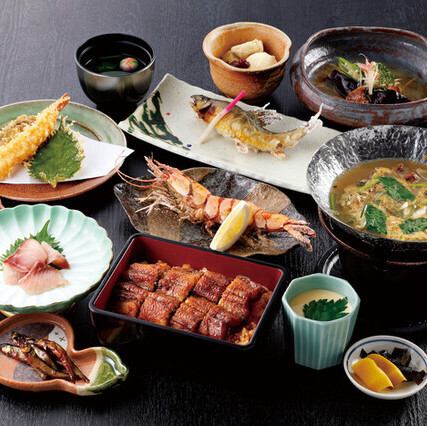 佃煮、鯉の洗い、大海老塩焼き、茶碗蒸し、天ぷら、鉢物、国産の天然うなぎをつかったうな重、香の物、吸い物にデザートまでついた充実のお食事コース。各種お集りにもピッタリです。ご予約はコースページにて承ります。